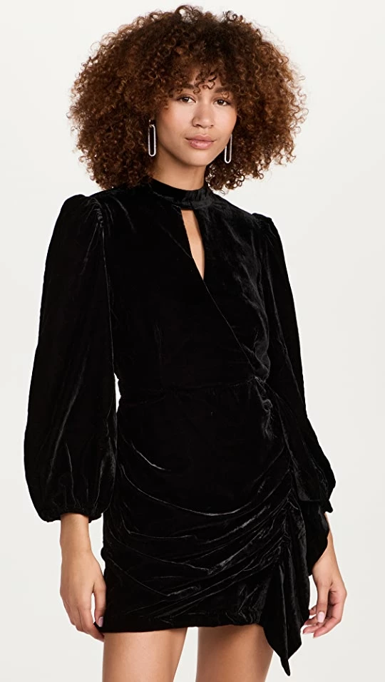 - Mock neckline and long blouson sleeves with elastic cuffs