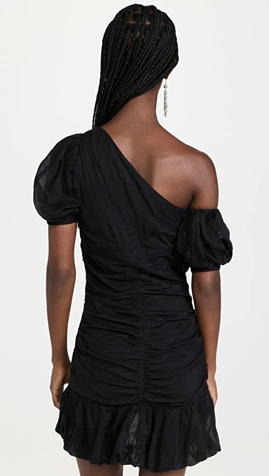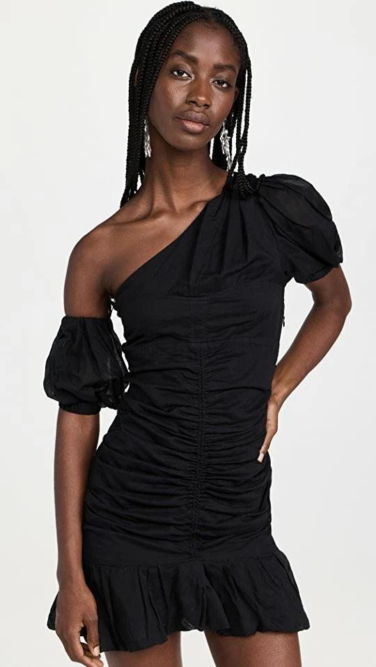 - One-shoulder neckline with single puff sleeve and arm band