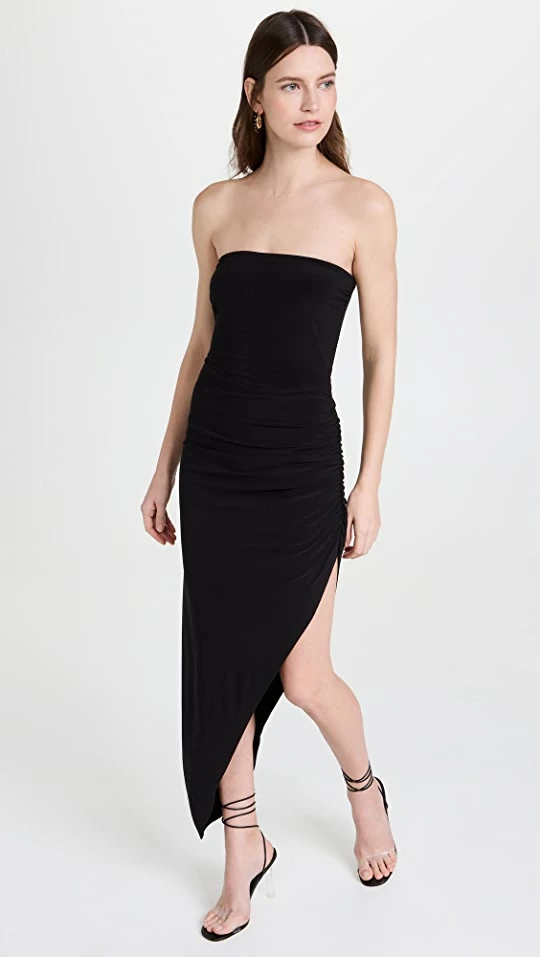 Angular asymmetry distinguishes the sleek silhouette of this Norma Kamali strapless dress, which is crafted from the label’s signature slinky black fabric.