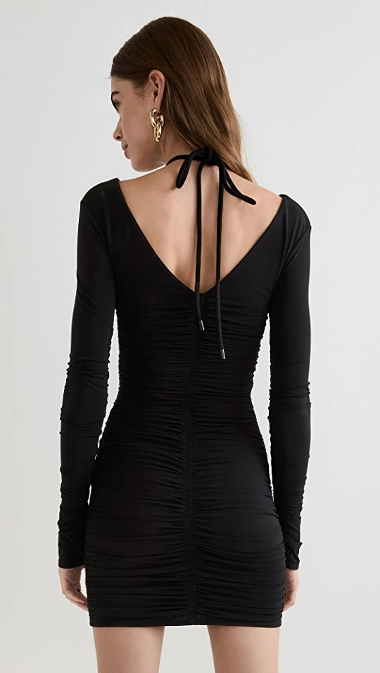 A classic piece for a special occasion, this black A.L.C. mini dress features allover ruching that enhances its figure-hugging fit, plus a deep-V neckline with halter ties.
