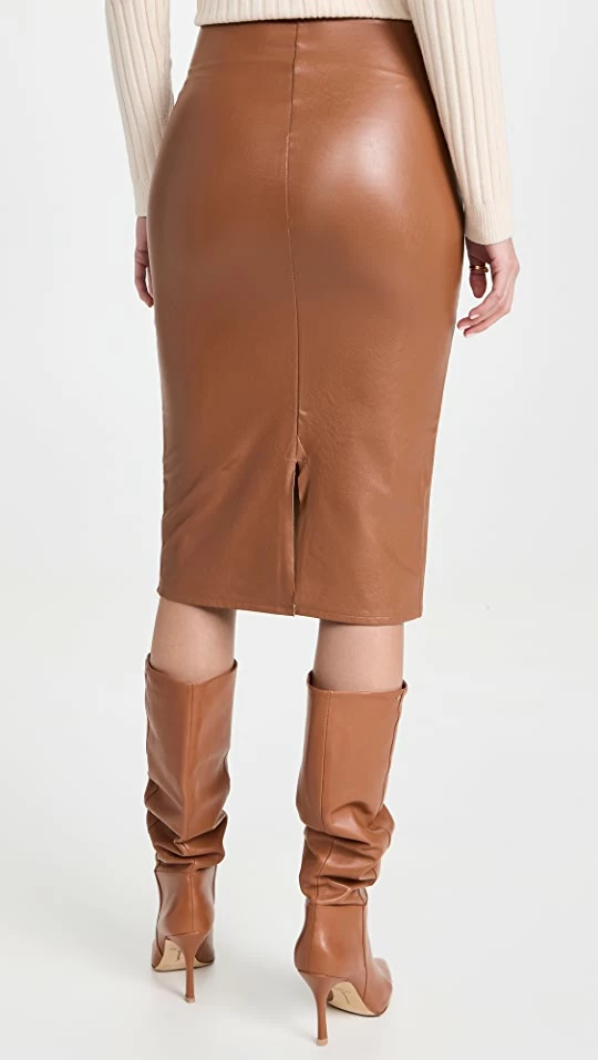 A sophisticated Commando pencil skirt in brown faux leather, featuring comfortable smoothing and a back vent. Wear yours with tonal boots, and add a cardigan to round out your outfit.