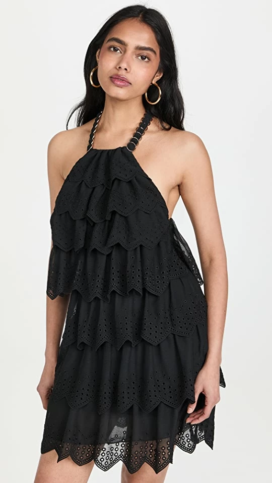 - Halter silhouette with tie closure at back